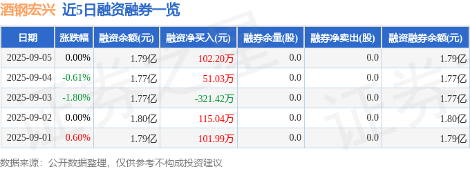 酒钢宏兴融资融券信息显示,融资方面,当日融资买入557.37万元,融资偿还455.17万元,融资净买入102.2万元。融券方面,融券卖出0.0股,融券偿还0.0股,融券余量0.0股,融券余额0.0万元。融资融券余额1.79亿元。